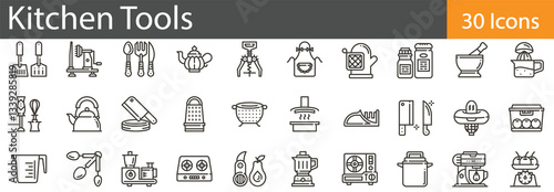 Kitchen Tools Line Icons Set. Collection of 30 outline icons representing essential kitchen tools and utensils for cooking and food preparation. Editable stroke vector illustration.