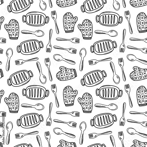Kitchen utensils seamless pattern background. kitchen set seamless pattern background. hand drawn doodle of kitchen set pattern background. Doodle illustrations of cooking utensils.