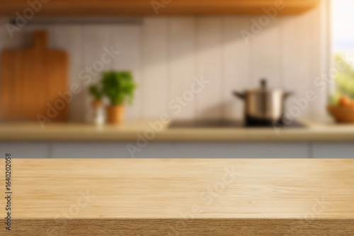 Kitchen wood table top for product display with blurred modern interior. Wooden tabletop over defocused kitchen background. kitchen furniture and desk space. product promotion in the kitchen