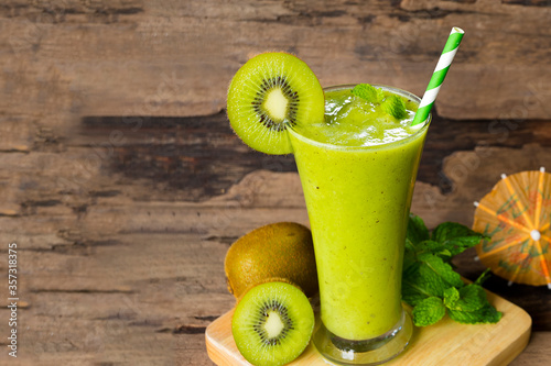 Kiwi yogurt fruit juice smoothie green colorful fruit juice milkshake blend beverage healthy high protein the taste yummy In glass drink episode morning on wood background.