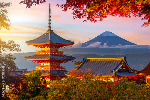 Kiyomizu-dera temple in Kyoto and mount Fuji at autumn sunset, Japan