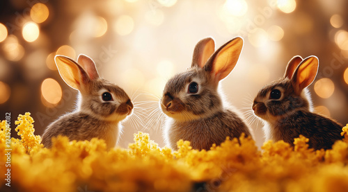 Kleiner, süßer Hase sitzt auf gelben Blüten
