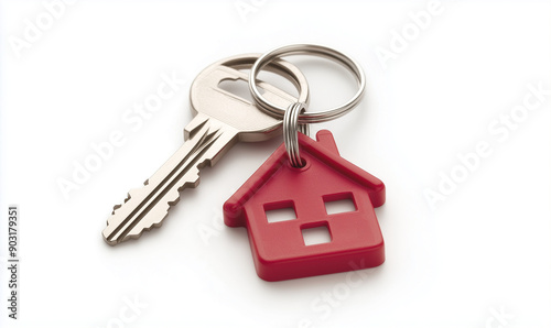 Klucze do mieszkania z breloczkiem w kształcie domu. Białe jednolite tło