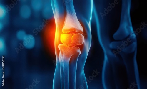 Knee Joint Anatomy Illustration in Blue Hues with Pain Highlighted in Orange Tones