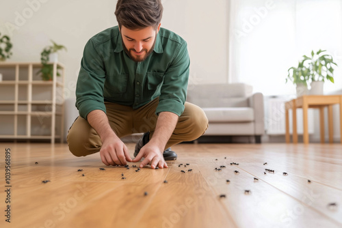 Kneeling Pest Control Expert Inspecting Insect Problem on Wooden Floor with Blurred Furniture in Background