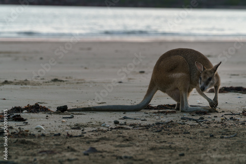 Kängurus bei Sonnenaufgang am Meer in Queensland Australien