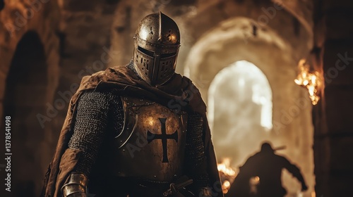 Knight in shining armor walks through torch-lit stone corridor in medieval castle at night