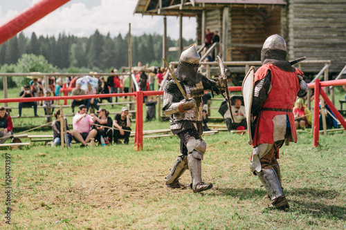 Knights in Battle with Silver Helmets and Armors: Medieval Event Reconstruction. Knights fight competition. Knights tournament.