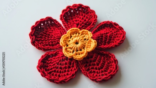 Knitted Cute Red Flower set against a White Background.