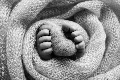 Knitted heart in the legs of a baby. Soft feet of a new born in a wool blanket. Close-up of toes, heels and feet of a newborn. Macro black and white photography the tiny foot of a newborn baby.
