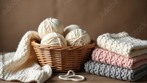 Knitted sweater made from yarn and knitting thread in closeup. Knitting as a pastime. Knitting accessories.