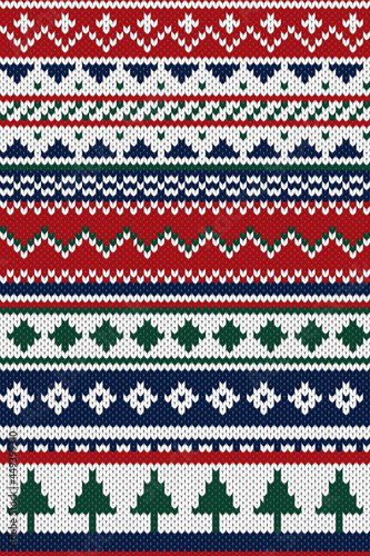Knitwear texture. Knitted seamless pattern in red, white, blue and green. Winter Christmas vector illustration. Ugly sweater ornament.