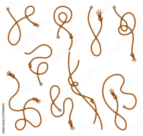 Knotted ropes with tassels and holes set. Knot cord curve, rope sailor marine. Curtain tassels, realistic rope elements. Isolated marine twisted loops. illlustration