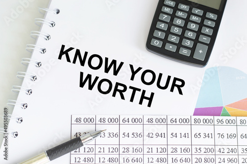 Know Your Worth inscription on a notepad on a table next to a calculator, pen, accounting reports and charts
