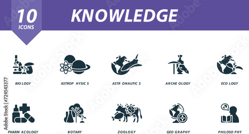 Knowledge icons set. Creative icons: biology, astrophysics, astronautics, archeology, ecology, pharmacology, botany, zoology, geography, philosophy.