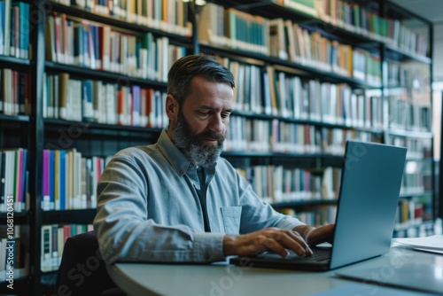 Knowledgeable teacher engaged with laptop in modern library setting during the day
