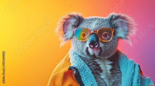 koala. Looking cool in fashionable clothes and glasses. Wide banner with space for text on the right. bright lighting. A stylish animal posing as a supermodel.