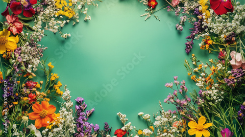 Kolorowy wieniec z polnych kwiatów otaczający zielone tło, tworzy naturalną i radosną kompozycję.