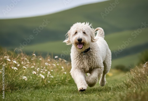 komondor dog running outdoors, white doggy playing in the countryside, hairy friend outside on meadonw