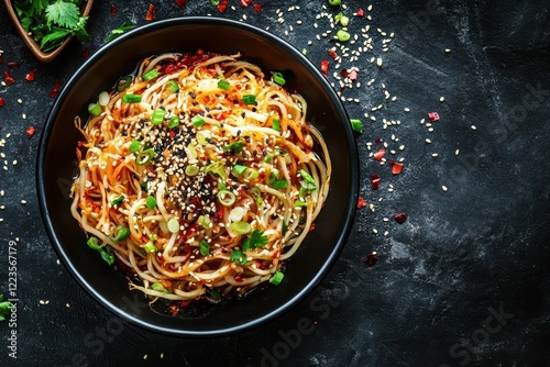 Kongnamul Muchim a traditional Korean salad of spicy mung bean sprouts with garlic sesame green onions soy sauce and spices Top view selective focus blank space