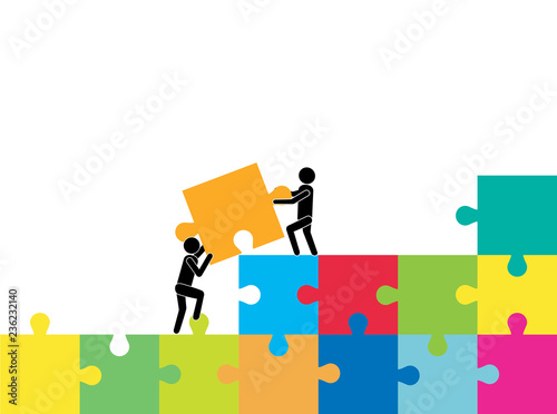 Kooperation. Collaboration.Business people pushing and assembling jigsaw puzzle.