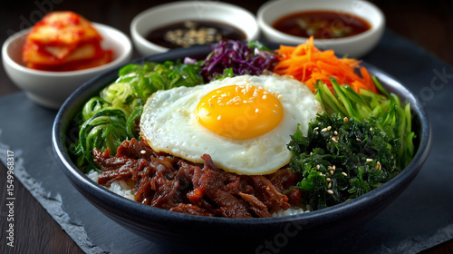 Korean beef bibimbap with assorted vegetables, fried egg, kimchi, and sauces on dark slate background Asian lunch concept, Korean rice dish, egg yolk centerpiece, fermented side di