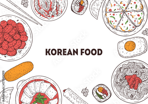 Korean food frame. Hand drawn top view Korean food dishes vector sketch illustration. Bulgogi, corndog, jjigae, kimbap, japchae, pajeon, mandu, egg bread