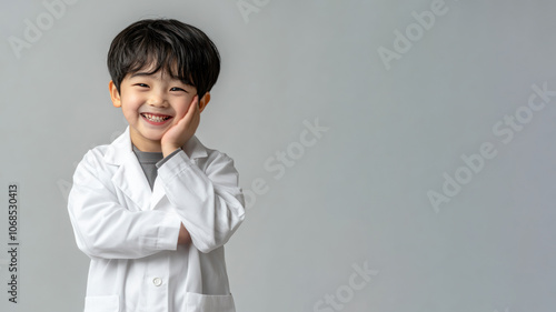Korean little boy smiling excited wearing doctor lab coat image ideals