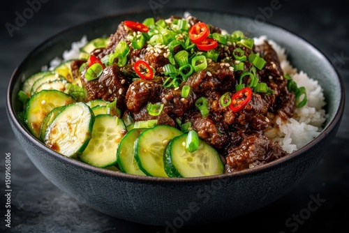 Koreanisches Bulgogi mit Rindfleisch und Gemüse serviert auf Reis asiatische Bowl mit mariniertem Fleisch Gurken Karotten Frühlingszwiebeln traditionelles koreanisches Gericht Nahaufnahme Food Fotogra