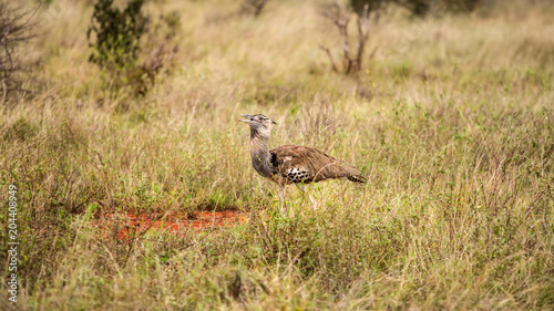Kori bustard (Ardeotis kori struthiunculus) walking in grass. Tsavo east national park, Kenya