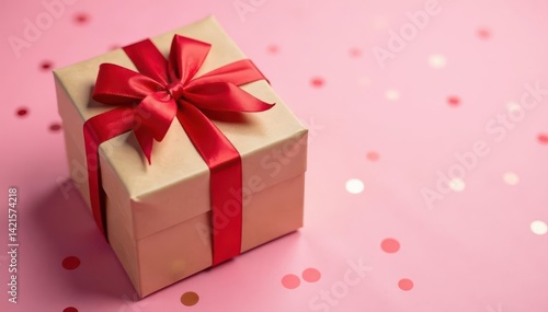 Kraft gift box with red bow, pink confetti background, holiday present , surprise, kraft box