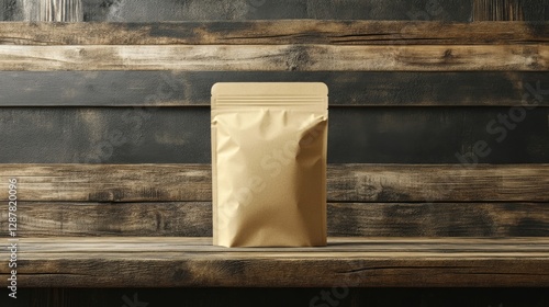 Kraft Paper Pouch on Rustic Wooden Background