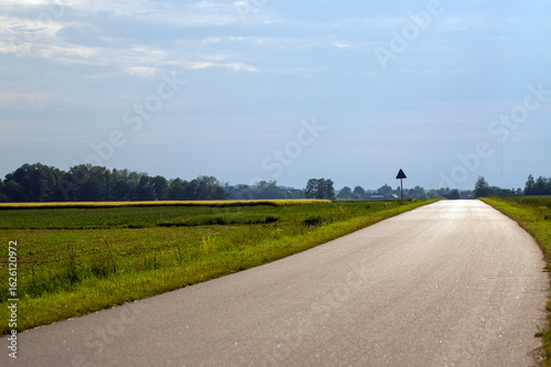 Krajobraz droga asfaltowa wśród pól światło słoneczne.