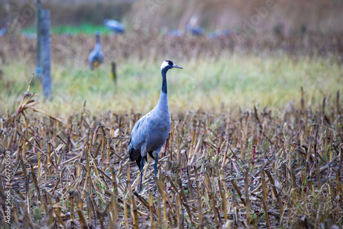 Kranich auf einem abgeernteten Maisfeld am Kranorama bei Günz.
