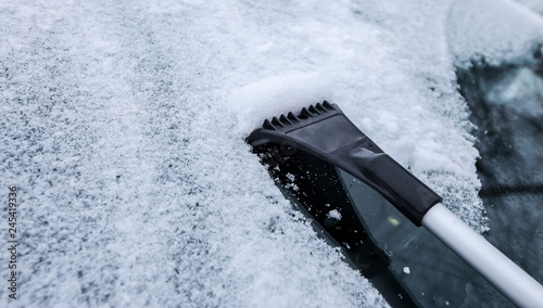 Krasnodar, Russia-December 26, 2018. Cleaning the car from the snow with a plastic scraper. Extreme snowfall in european city