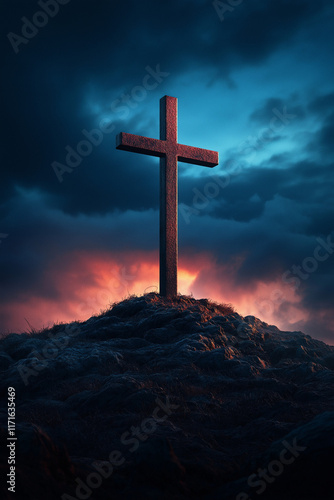 Kreuz auf dem Hügel: Lichtstrahlen durch dunkle Wolken