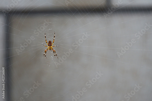 Kreuzspinne in ihrem Netz vor einer Wand