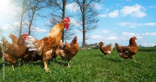 Krähender Hahn zusammen mit einer Scharr Legehennen auf einer Hühnerweide.