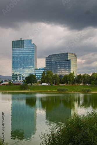 Kuchajda lake in Bratislava, nature in town, with vegetation and modern buildings reflecting the light