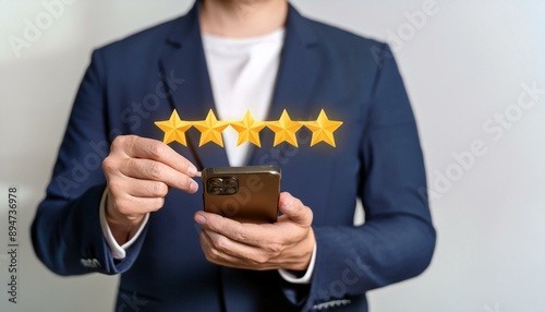 Kundenbewertung, positives Feedback. Kundenzufriedenheit oder Benutzererfahrungsforschung. Qualität von Produkt und Service, Erfahrungsbewertung. Zufriedenheitsfeedback-Bewertungskonzept 5 Sterne