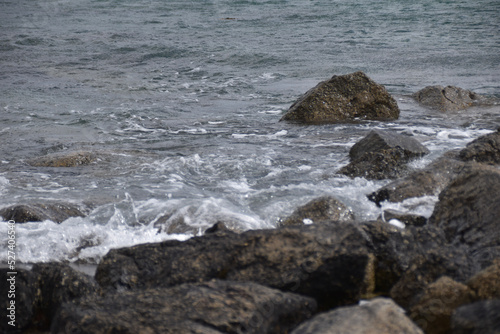 Küstenlinie mit Felsen aus rosa Granit in der Bretagne mit blauem Himmel und Meer mit Wellen