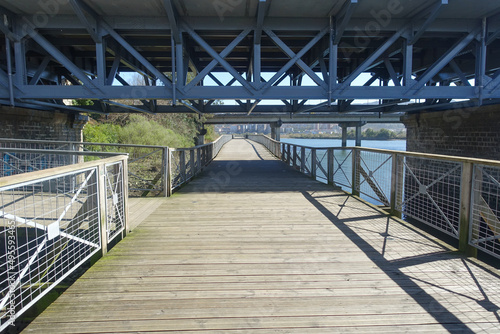 La passerelle d'Hendaye piétonne sur le fleuve de la Bidassoa qui passe sous le pont de fer