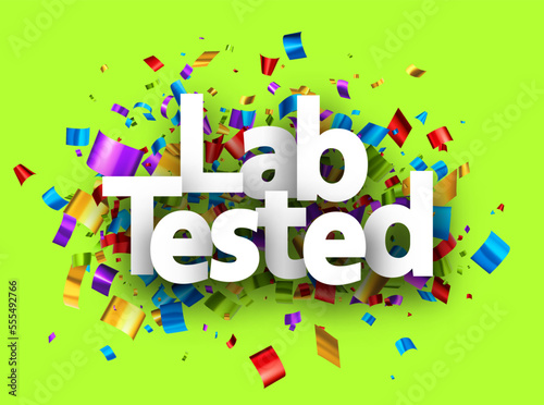 Lab tested sign with colorful cut out foil ribbon confetti background.