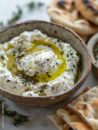 Labneh with olive oil, herbs, served with baked flatbread.
