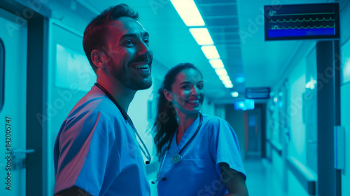 Labor Day, two healthcare workers smiling in a hospital corridor, fluorescent lighting, professional and compassionate atmosphere, medical equipment and signage in the background