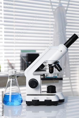 Laboratory analysis. Flask with blue liquid and microscope on white table indoors