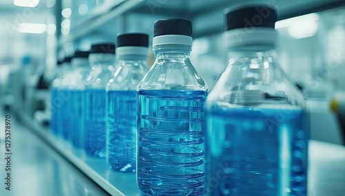 Laboratory bottles with blue liquid on stainless steel shelves