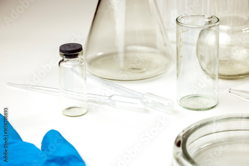 Laboratory equipment including glass beakers, pipettes, and a vial on a white surface.
