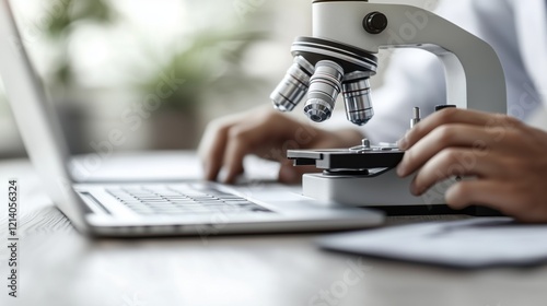Laboratory examination of samples using a microscope next to a laptop on a wooden desk during a research session