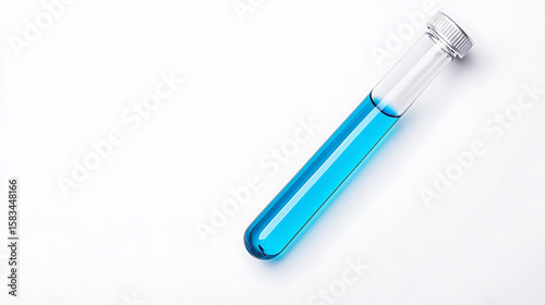 Laboratory glassware: A glass test tube filled with a bright blue liquid stands against a crisp white background, evoking scientific precision.